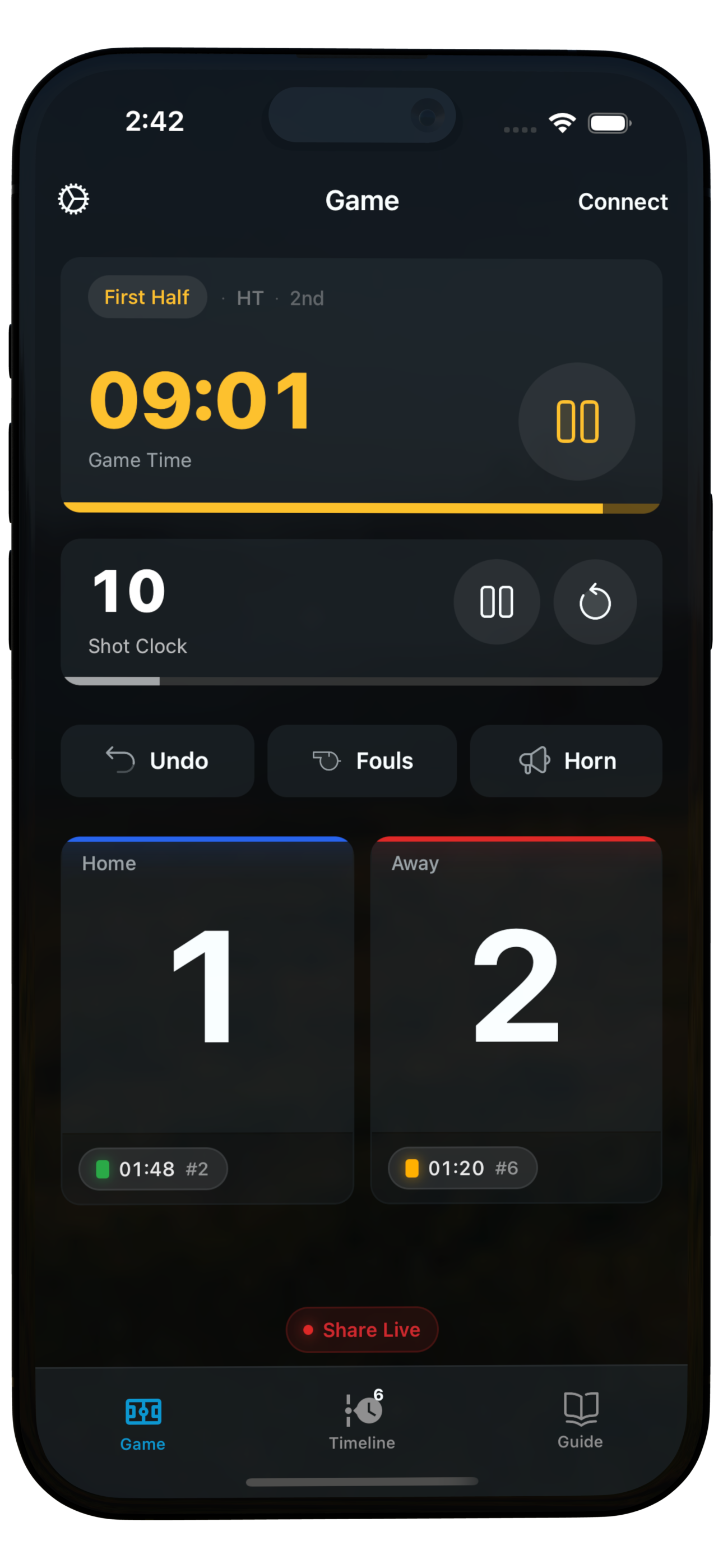 Track fouls, cards, and timed exclusions. Visual countdown for penalty box timers.